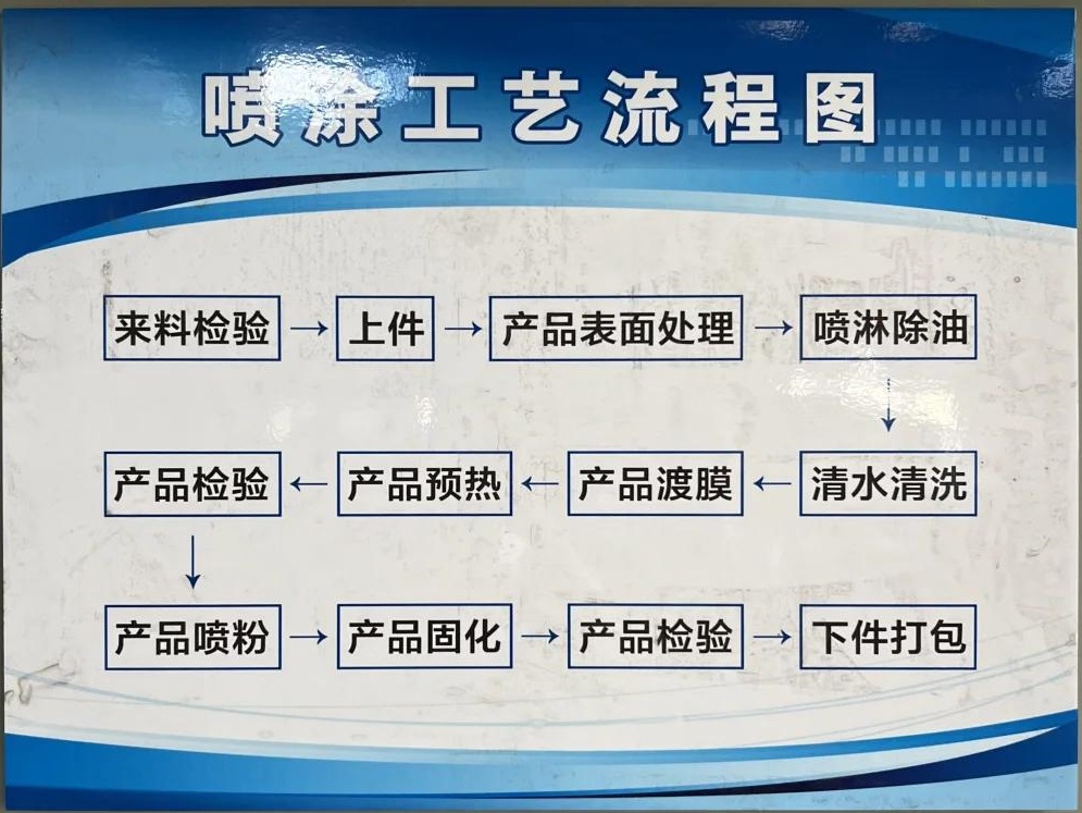 除油除锈→水洗→磷化→烘干→喷粉→固化→冷却